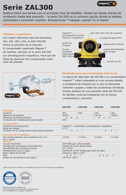 Con cuatro diferentes tipos de aumentos, 20x, 24x, 28x y 30x, la serie ZAL300 ofrece la precisión de tu elección. El compensador patentado Magnex™ de GeoMax utilizado en la serie ZAL300 con amortiguación magnética, hace que las fallas de atascado del compensador sean cosa del pasado.