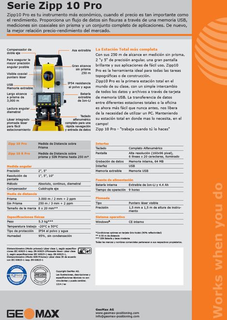 Con sus 250 m de alcance en medición sin prisma, 2 "y 5" de precisión angular, una gran pantalla brillante y sus aplicaciones de fácil uso, Zipp10 Pro es la herramienta ideal para todas las tareas topográficas o de construcción. Zipp10 Pro es la primera estación total en el mundo de su clase, con un simple intercambio de todos los datos y archivos a través de tarjeta de memoria USB. La transferencia de datos entre diferentes estaciones totales o la oficina es ahora más fácil que nunca antes, nos libera de la necesidad de utilizar un PC. Manteniendo su estación total en donde mas lo necesita, en el campo!